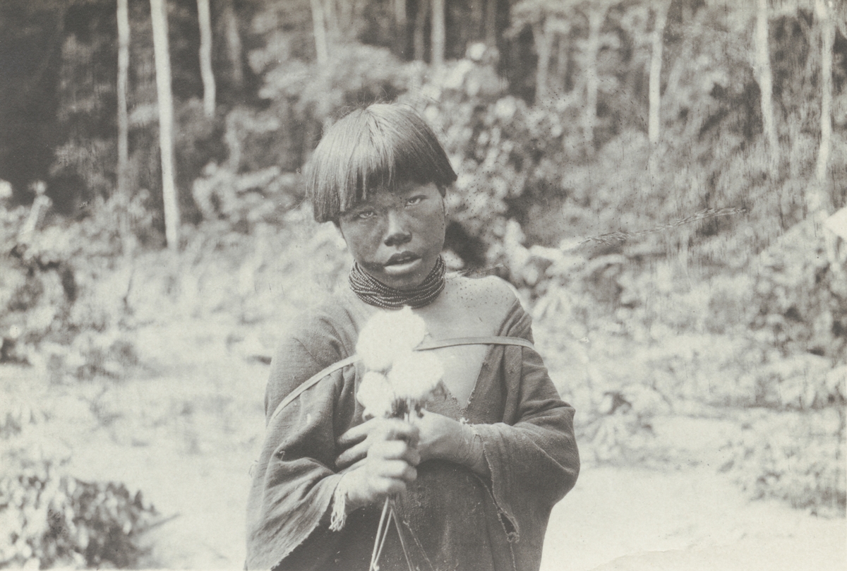 Fotografi från kuvert märkt med "Ernst Nordenskjöld". Motiv av ung man som håller i en bukett med blommor i djungeln.