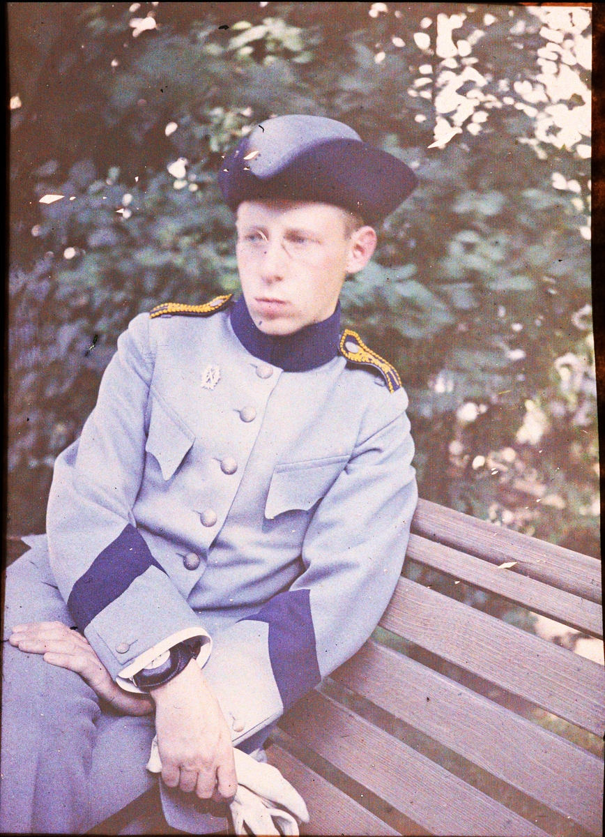 Lumières-autokrom. Värnpliktige I. (Iwan) Jäderström vid I1. På bildens kant står det Svea Livgarde.