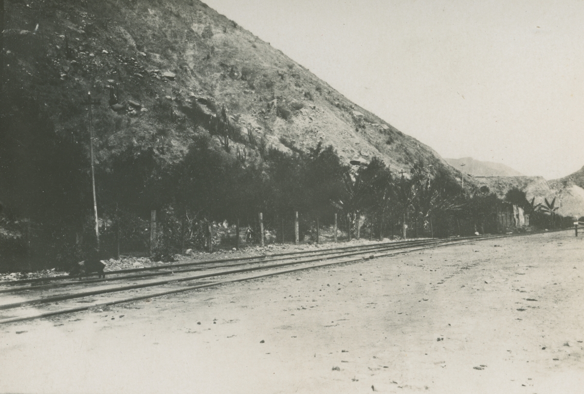 Fotografi från expedition till Peru 1920. Motiv av ett järnvägsspår som går genom ett bergslandskap.