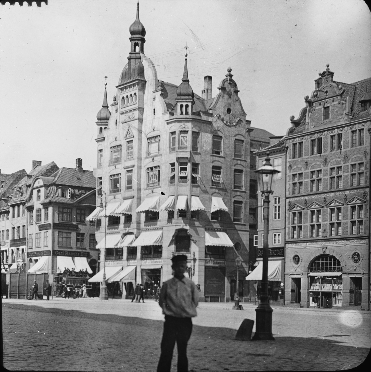 Skioptikonbild med motiv från Amagertorv i Köpenhamn vid sekelskiftet 1900.