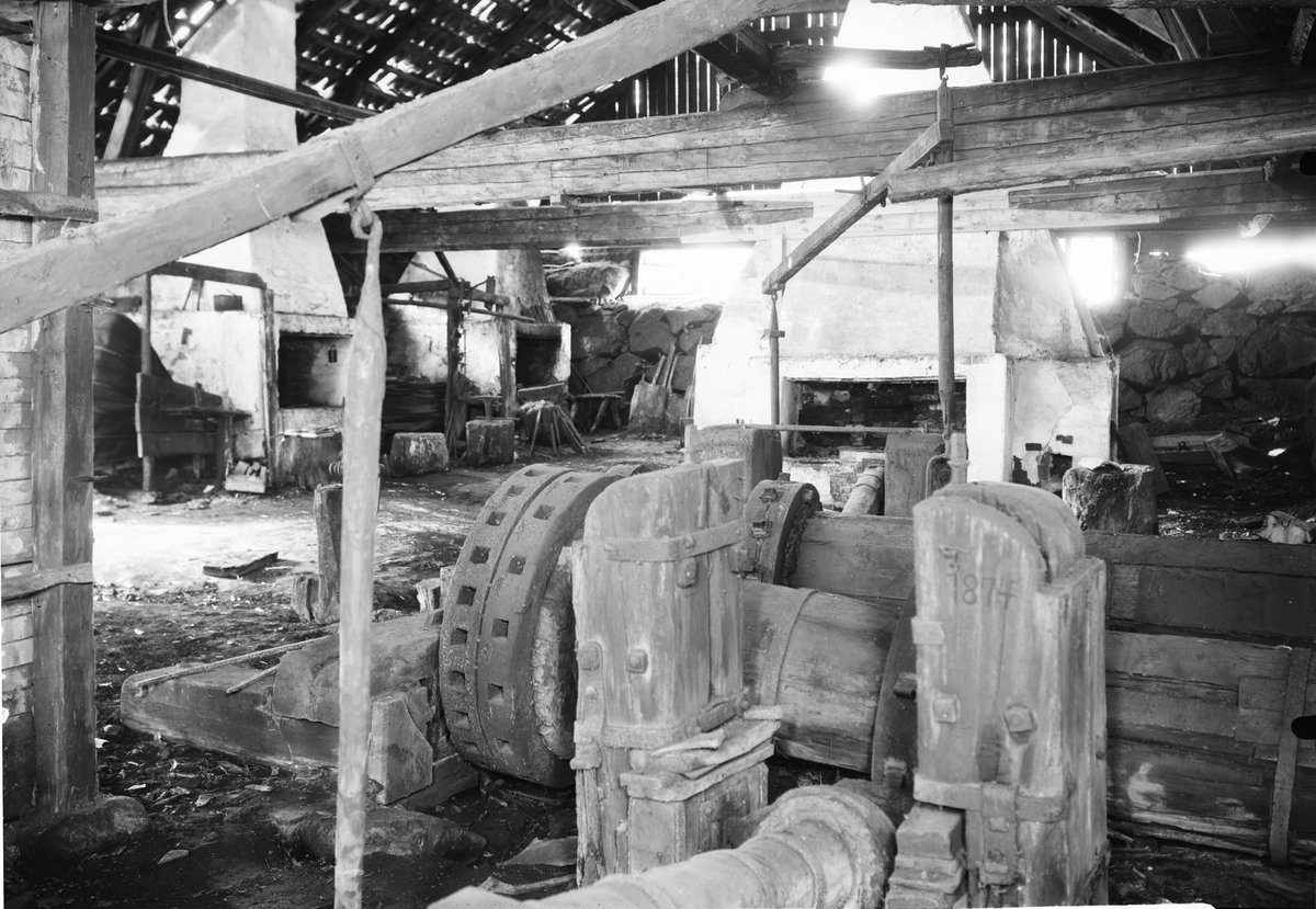 Interiör av stora smedjan. I bakgrunden till vänster två små härdar, till höger fyrhärd. I förgrunden skyllerstolparna till nedre hammaren. Fotopunkt 4.