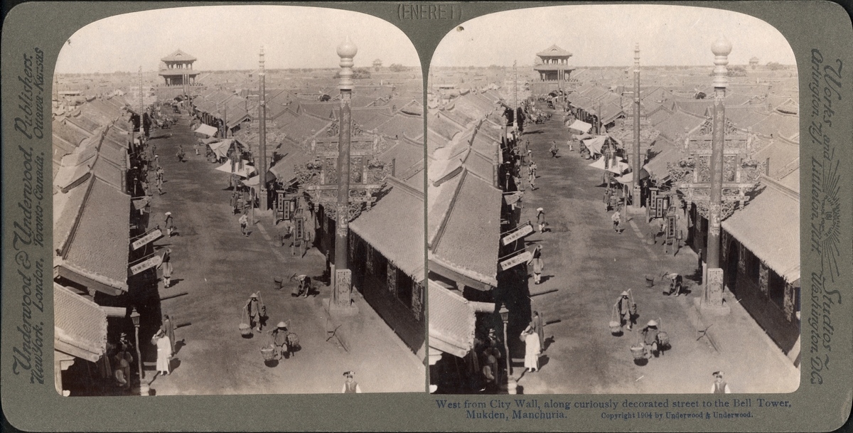 Stereobild av väl utsmyckad gata, vilken leder fram till Bell Tower, Mukden, Manchuria.