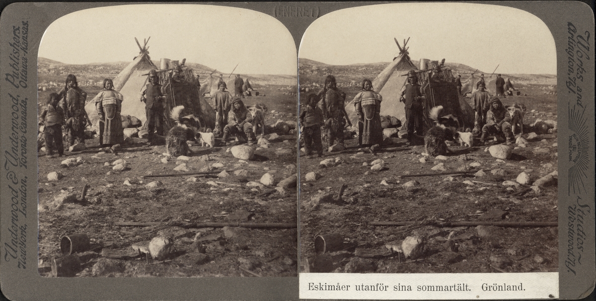 Stereobild av eskimåer vid sina sommartält på Grönland.