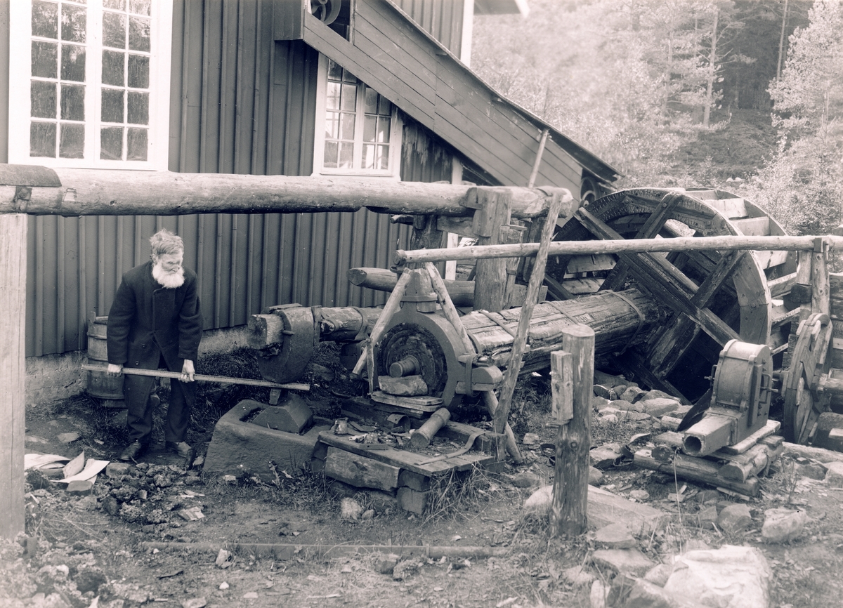 Smeden Karl Onsbäck, allmänt kallad "Kalle i Blaska" av den anledningen, att det endast "blaskade lite i den bäck, där han i 40 år använt den lilla hammaren. Anläggningen finns vid Stenfors under Stenshestra, Åkers, sn., Skillingaryd. Sedan branden 1926 står hammaren under bar himmel därav detta foto, taget i sepember 1930.
