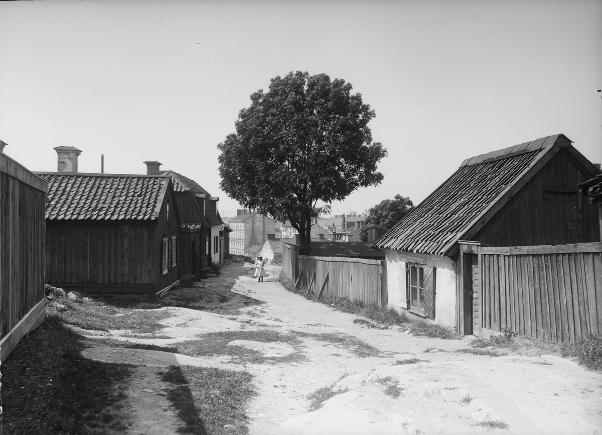 Parti av Södermalm i Stockholm. Trähus vid Bergsprängargränd i Vitabergsparken,