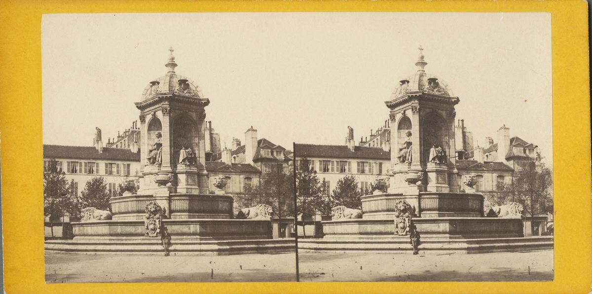 Stereobild med motiv av Fontaine Saint-Sulpice. Det är en monumental fontän vid Place Saint-Sulpice i Paris. De är konstruerad mellan 1843 och 1848 av arkiteken Louis Visconti, som även designade Napoleons grav.
