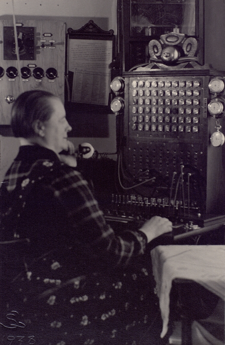 Karungi Telefonväxel. Telefonisten fröken Helny Hynylä som p.g.a. sjukdom blivit blind vid 3 års ålder, har varit anställd vid stationen sedan den inrättades 1908.