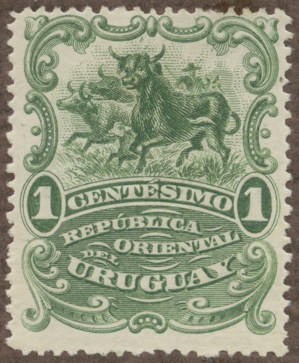 Frimärke från Uruguay, 1900. Motiv av Hornboskap i frihet