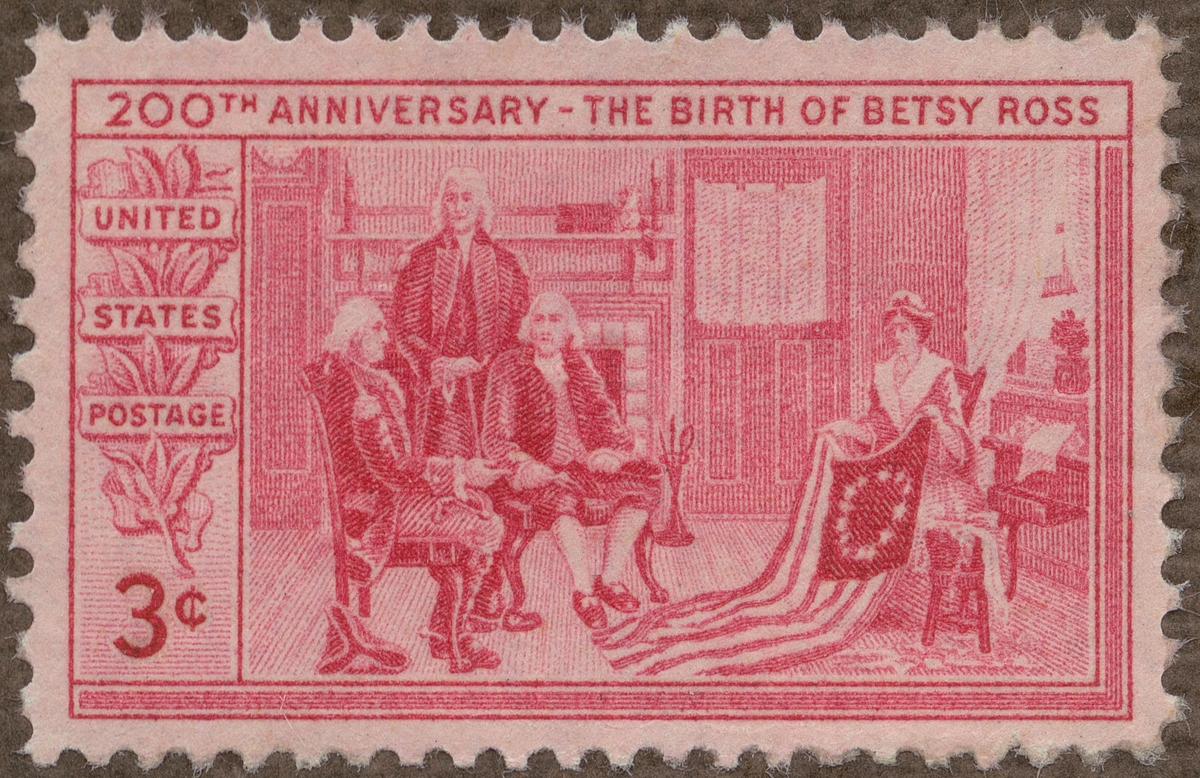 Frimärke från U.S.A., 1952. Motiv av Den första USA-flaggan: (bild). efter tavla av C. H. Weis-Gerber. Betsy Ross visar flaggan åt flaggkommittén: General George Washington, Robets Morris och Hon. George Ross. -200-årsminne av flaggans skapare: Betsy Ross, född 1752. 1752-1952.
