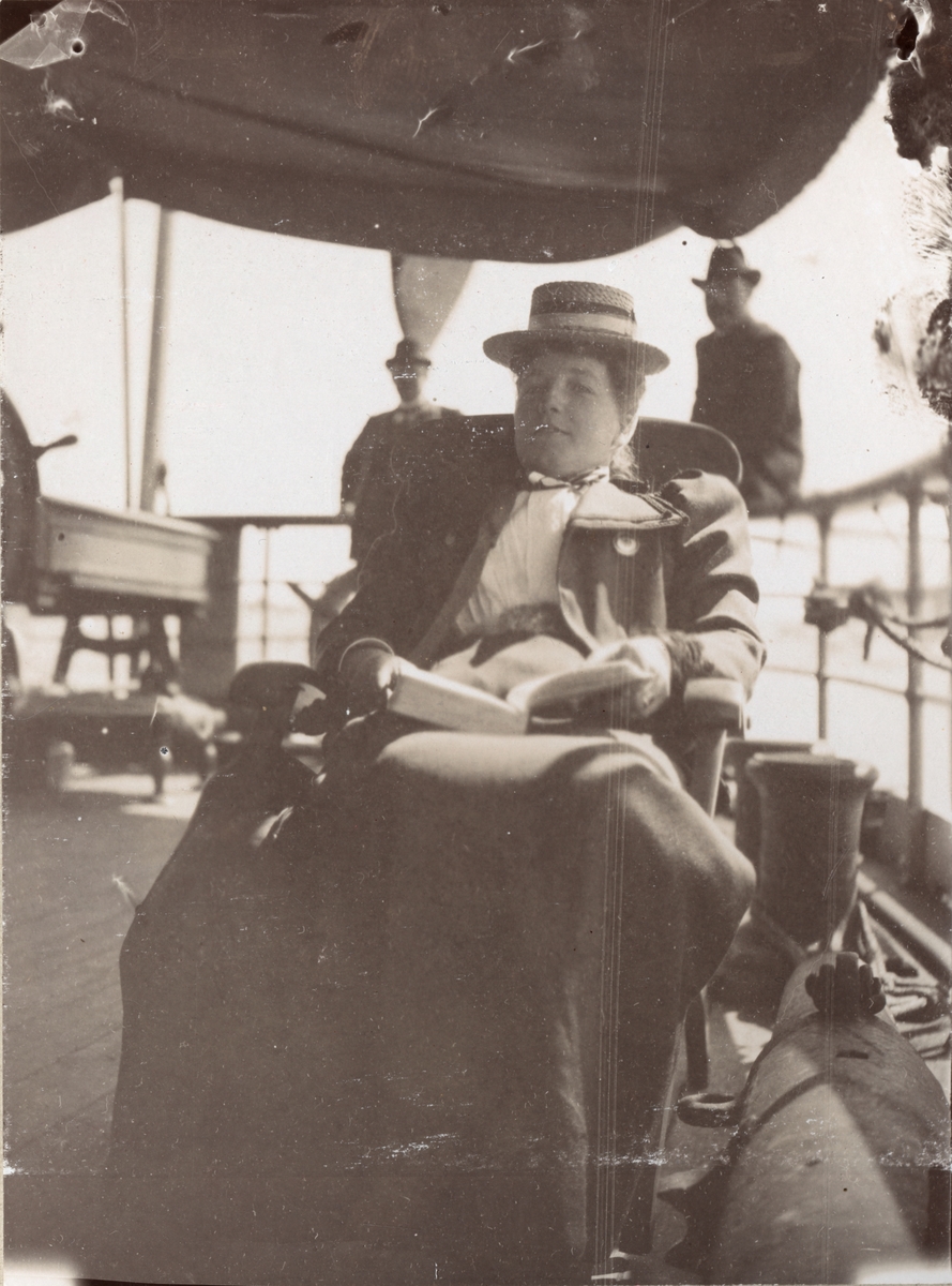 Titel: Mrs Sutton läser en bok på däck. Ur album: Kabelexpedition Gotland - Dalarö 1898.