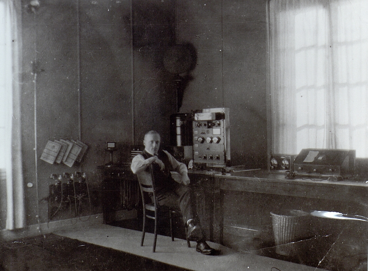 Interiör från den första radiostationen i Hörby. Mannen är Arthur Emanuel Svensson. Sedemera radiokommisarie i Boden.