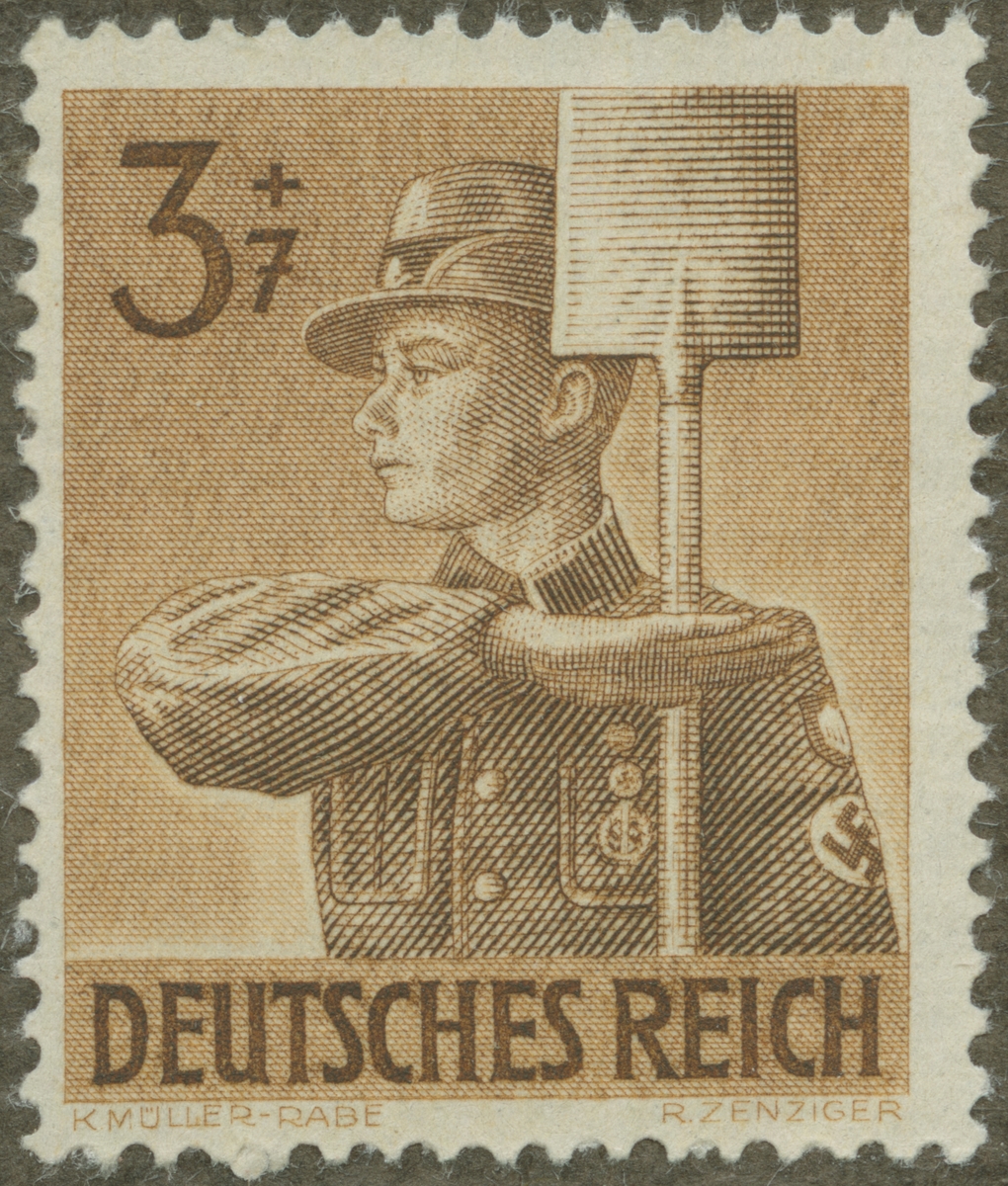 Frimärke från Tyskland, 1943. Motiv av Vägarbetare med spade "9-årsminne av Arbetes armé"