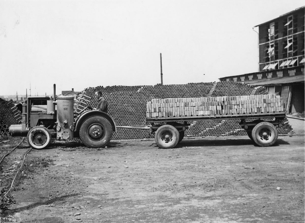 Traktortåg från Wulf & Co AB i Vänersborg. Traktorn är försedd med en Ford 4 cylindrig motor, väger totalt 1800 ton och kan med lätthet dra 2 lastade släpvagnar om vadera 4 tons last. Farten kan hållas till 25 km/ tim, men enligt gällande bestämmelser är tillåtna hastigheten 20 km/tim.