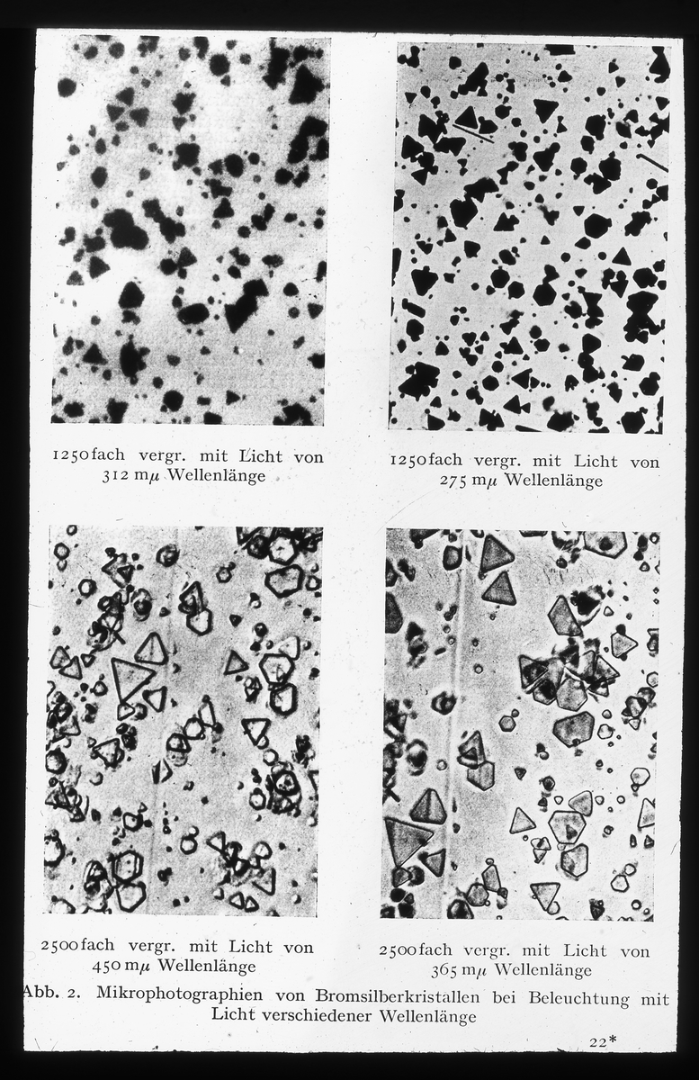 Mikrofotografi av bromsilverkristaller belysta med ljus av olika våglängd.