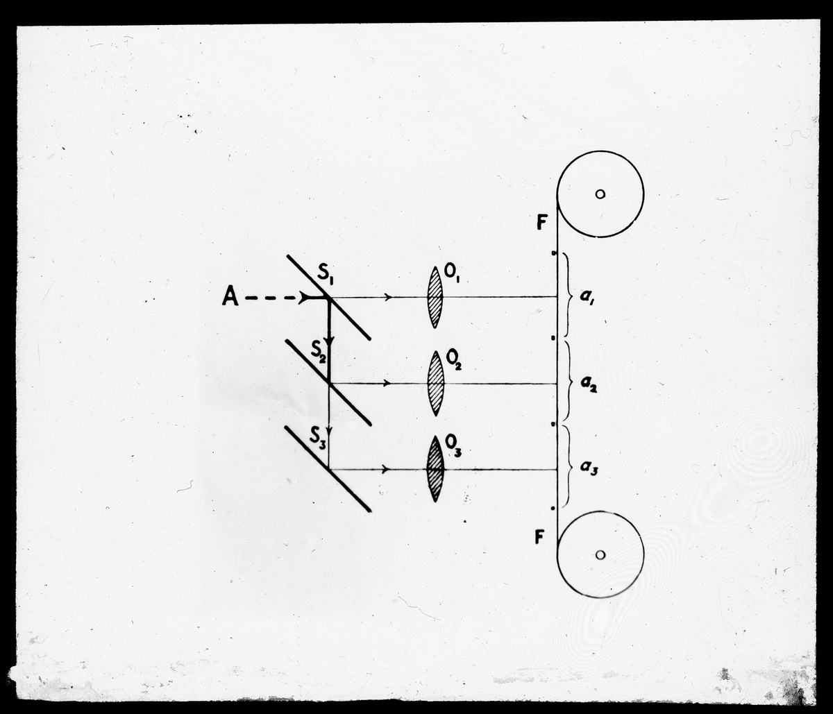 Schematisk framställning av Horsts anordning för trefärgsfotografering.