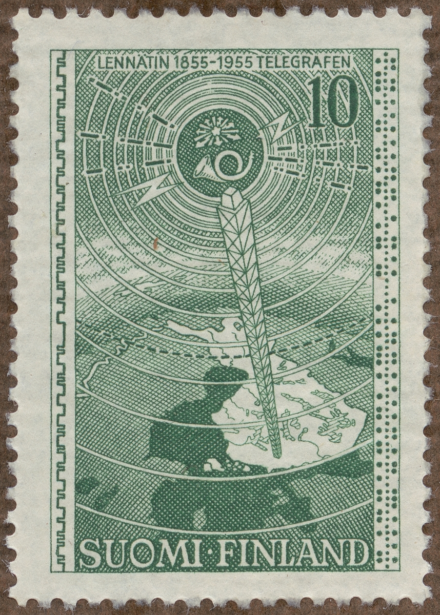 Frimärke ur Gösta Bodmans filatelistiska motivsamling, påbörjad 1950. Frimärke från Finland, 1955. Symboliskt Radiomast och radiovågor "Finska telegrafen 100 år 1855-1955"