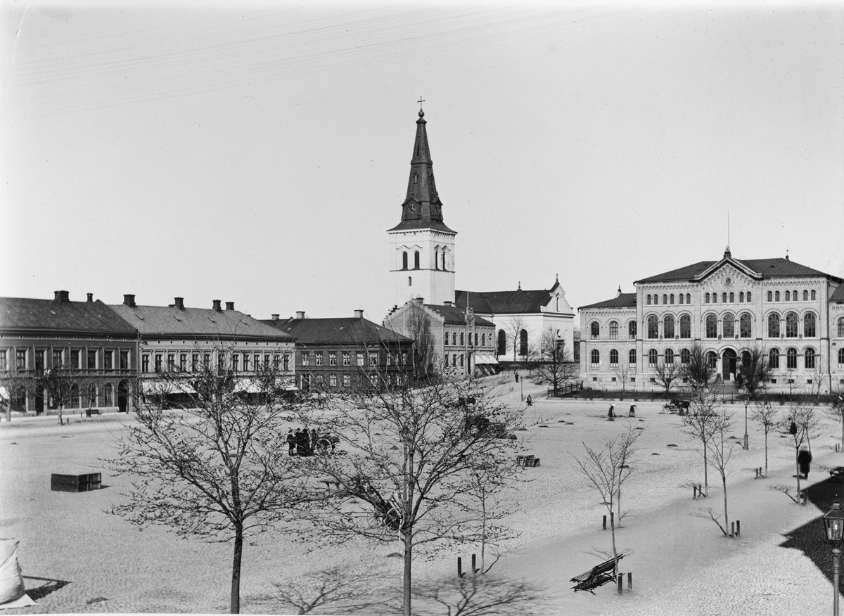Fotografi ur albumet "Karlstad" från 1898. Stora torget med domkyrkan i fonden. Tryckt av Hjalmar Petersson & Co.