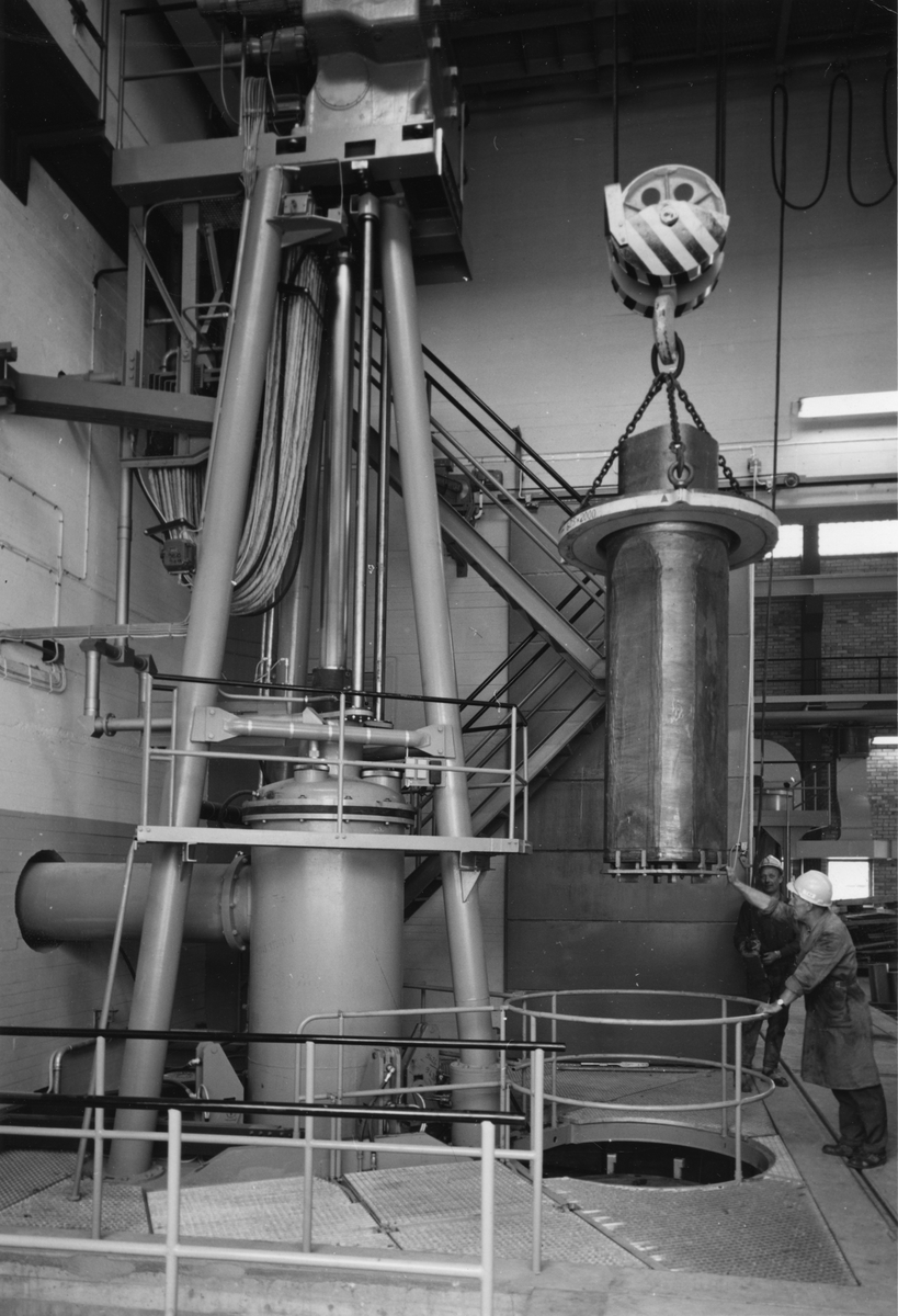 Sandvikens Järnverk (Sandvikens Jernverk). En av de två båda ungnarna i Sandvikens nya smältverk 64, som vid fotograferingstillfället var Europas största högvakuumsmältverk.