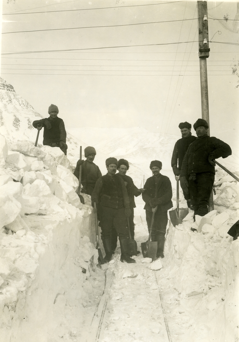 Sveagruvan. Snöskottning för ,aterialbanan till gruvan, 1918.