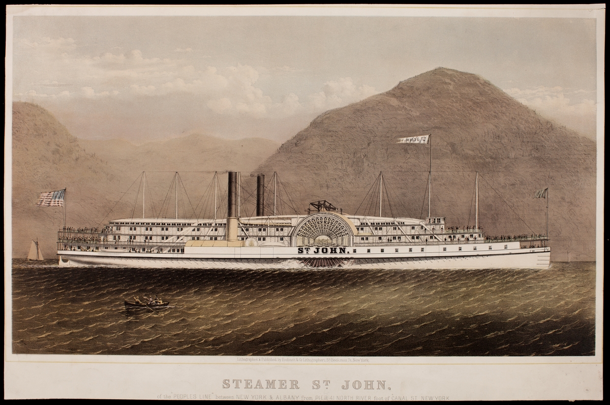 Plansch. Hjulångaren St. Hohn på linjen mellan New York och Albany från Pier 41 North River vid foten av Canal Street i New York.