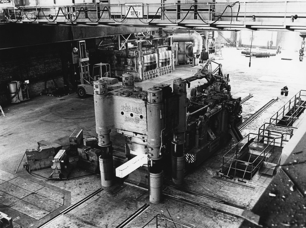 Uddeholms nya presssmedja. Städmagasin till vänster och ena manipulatorn till höger om smidespressen.