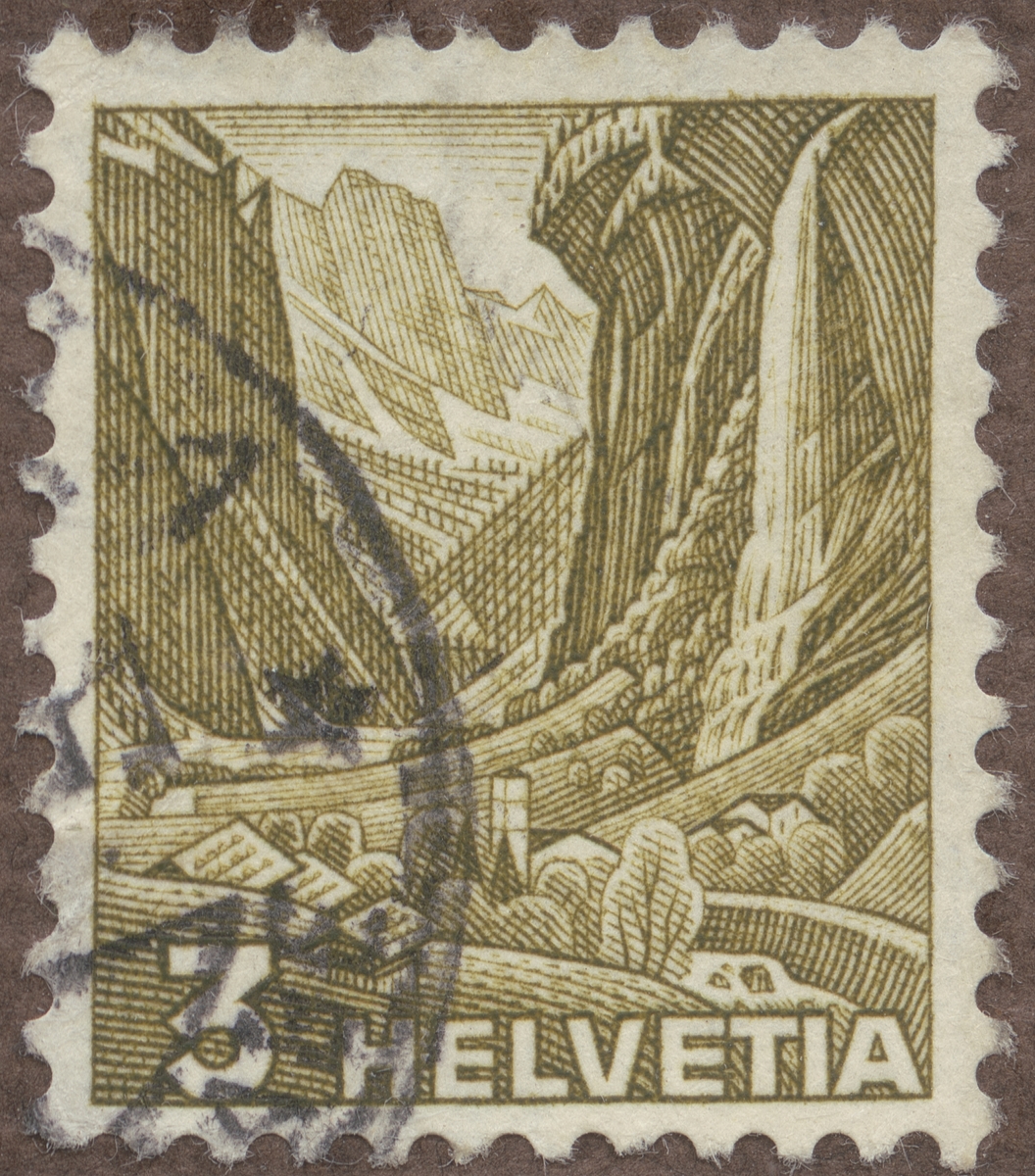 Frimärke ur Gösta Bodmans filatelistiska motivsamling, påbörjad 1950. Frimärke från Schwiz, 1936. Motiv av Staubachs vattenfall