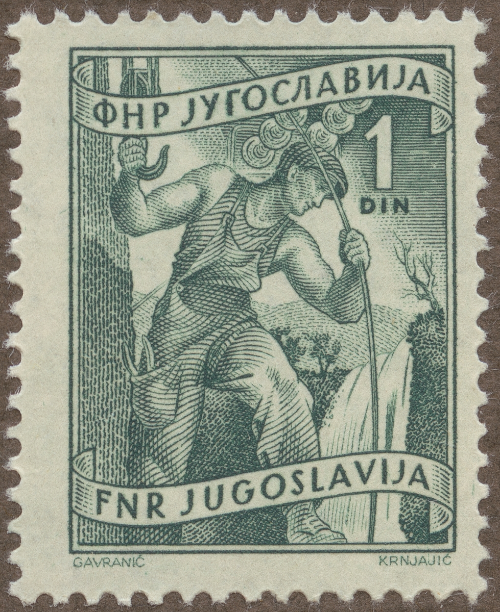 Frimärke ur Gösta Bodmans filatelistiska motivsamling, påbörjad 1950. Frimärke från Jugoslavien, 1950. Motiv av Elektrifiering
