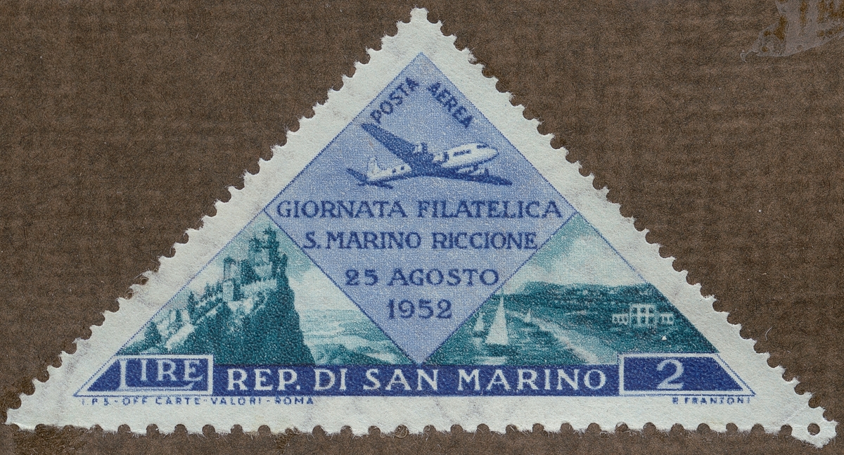 Frimärke från San Marino, 1952. Motiv av 4-motorigt Monoplan Landskapsbilder: San Marino - "Propaganda märke: Riccione Filateli Utställningen d. 25 augusti 1952."