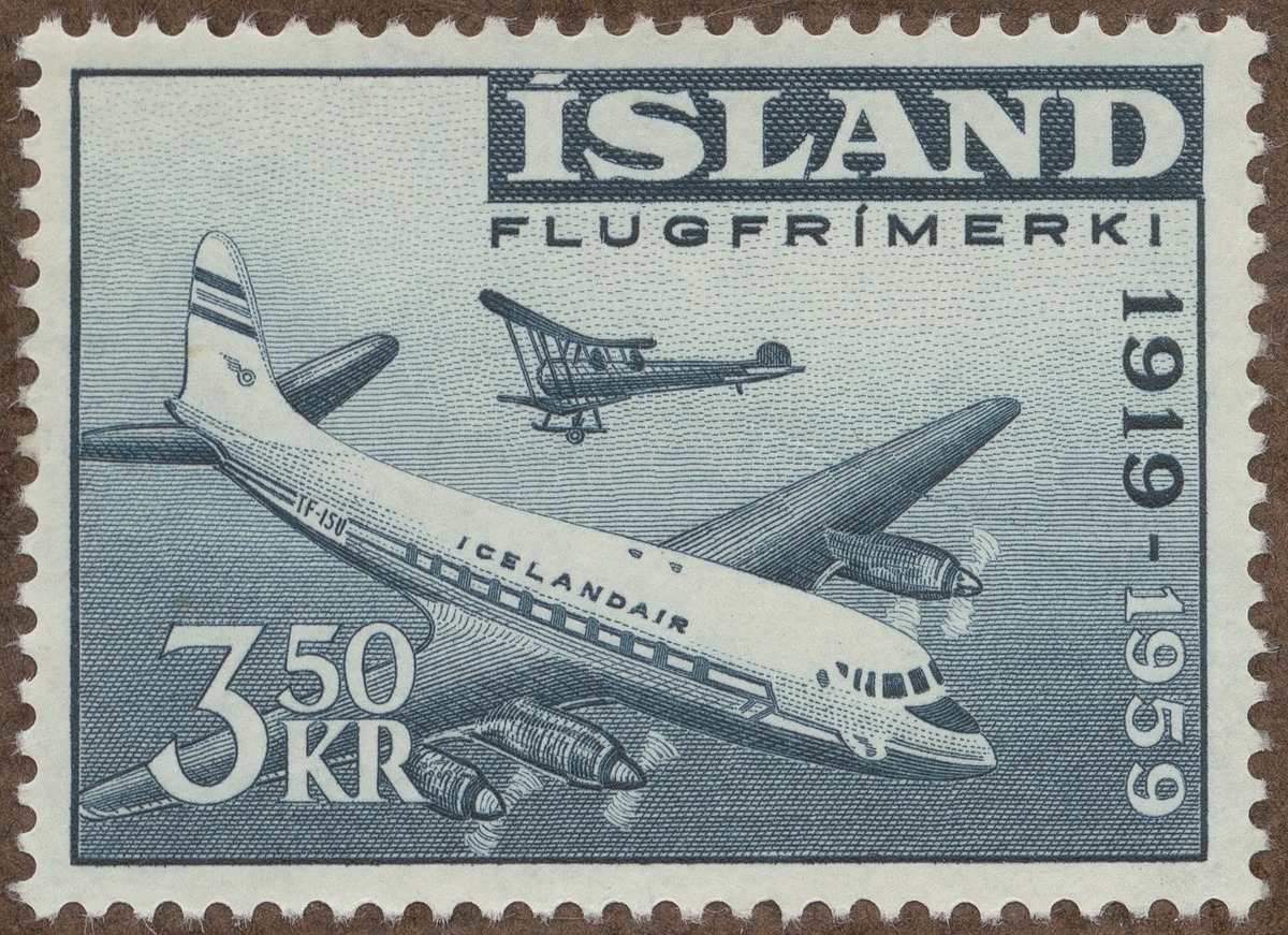 Frimärke från Island, 1959. Motiv av 4-motorigt modernt flygplan från "Icelandair"- linjen bredvid första primitiva modellen. "- Islandsk flygs 40-års jubileum: 1919-1959-"