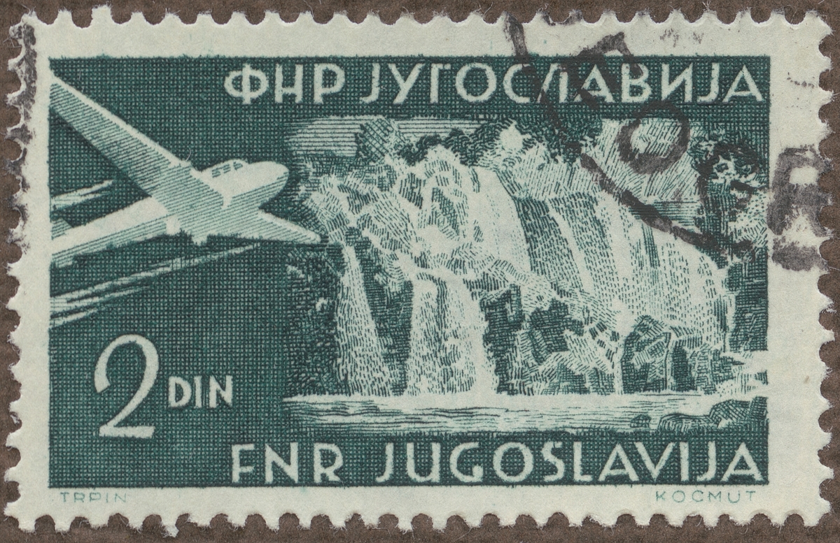 Frimärke från Jugoslavien, 1951. Motiv av Monoplan över Plitvice- fallen