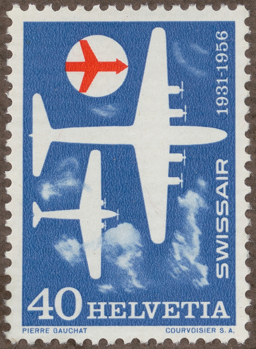 Frimärke från Schweiz, 1956. Motiv av Fyrmotorigt Monoplan Tremotorigt d:to "Swissair:s" bomärke i rött "Schweiziska flygbolaget "Swissair" 25 år: 1931-1956."