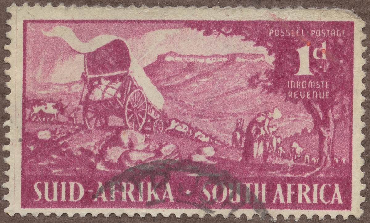 Frimärke ur Gösta Bodmans filatelistiska motivsamling, påbörjad 1950. Frimärke från Sydafrika, 1949. Motiv av Boernas oxvagn: "-"Voortrekkers" på väg till Natal-"