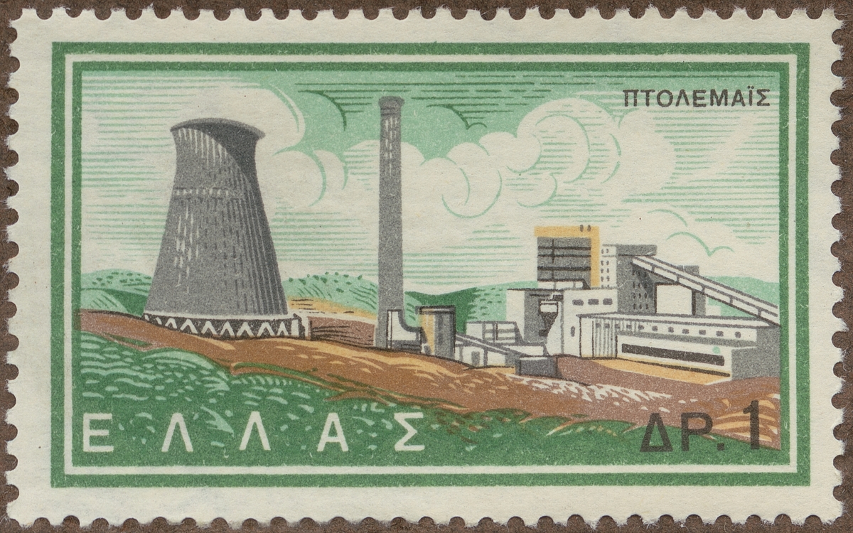 Frimärke ur Gösta Bodmans filatelistiska motivsamling, påbörjad 1950. Frimärke från Grekland, 1962. Motiv av "Serie Greklands elektrifiering". Kolkraftverket Ptolemais.