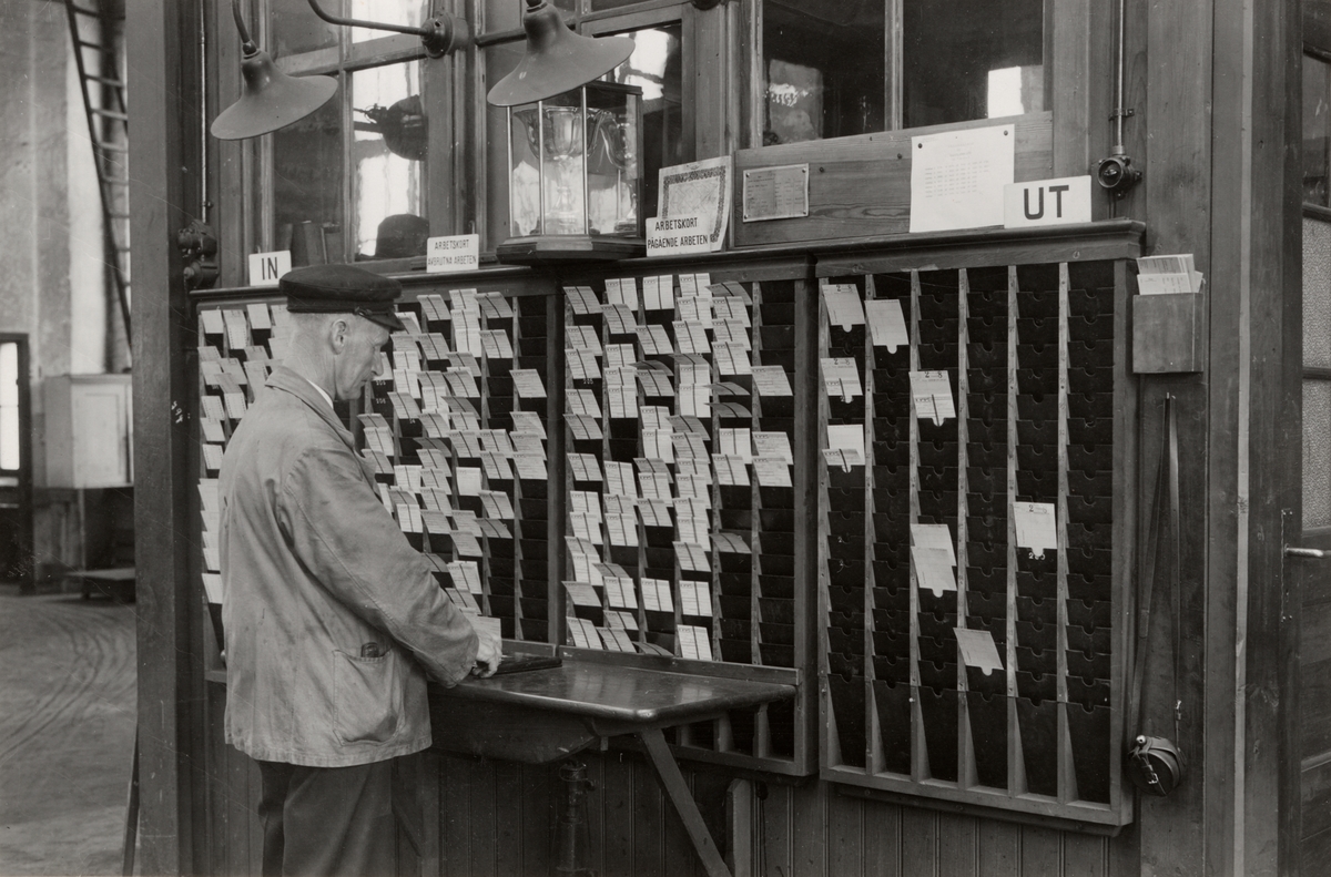 Stämpelapparat för tidskontroll jämte kortfack, på AB Gävle Vagnverkstad.
