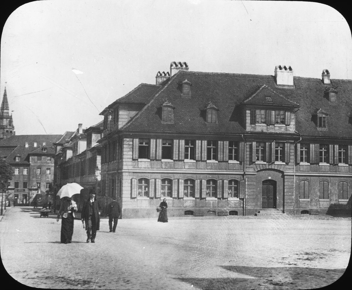 Skioptikonbild med motiv från Ansbach. Okänt hus, okänd gata.