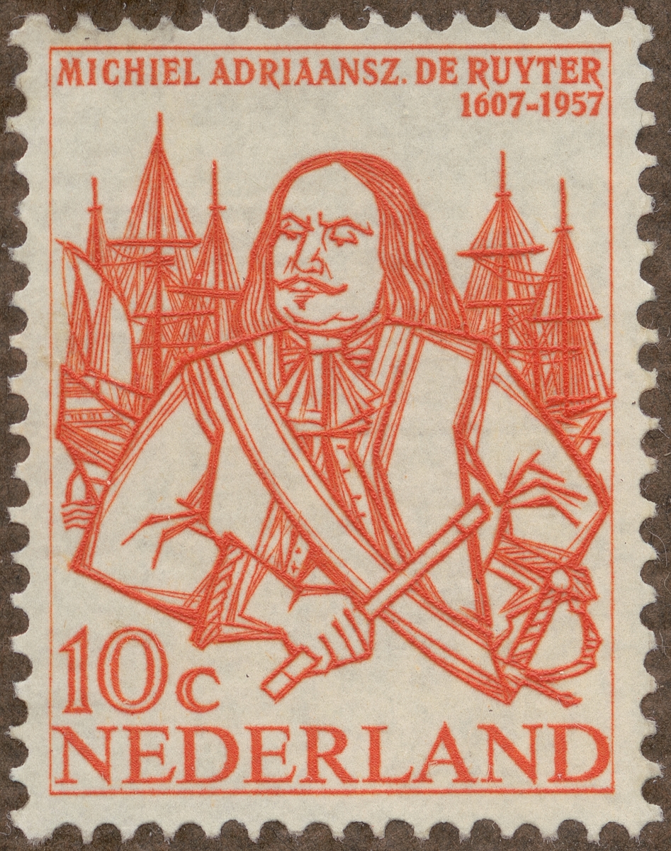 Frimärke från Nederländerna, 1957. Motiv av Michel Adriaandz De Ruyter (1607-1676) Amiral 350-års minne 1607-1957