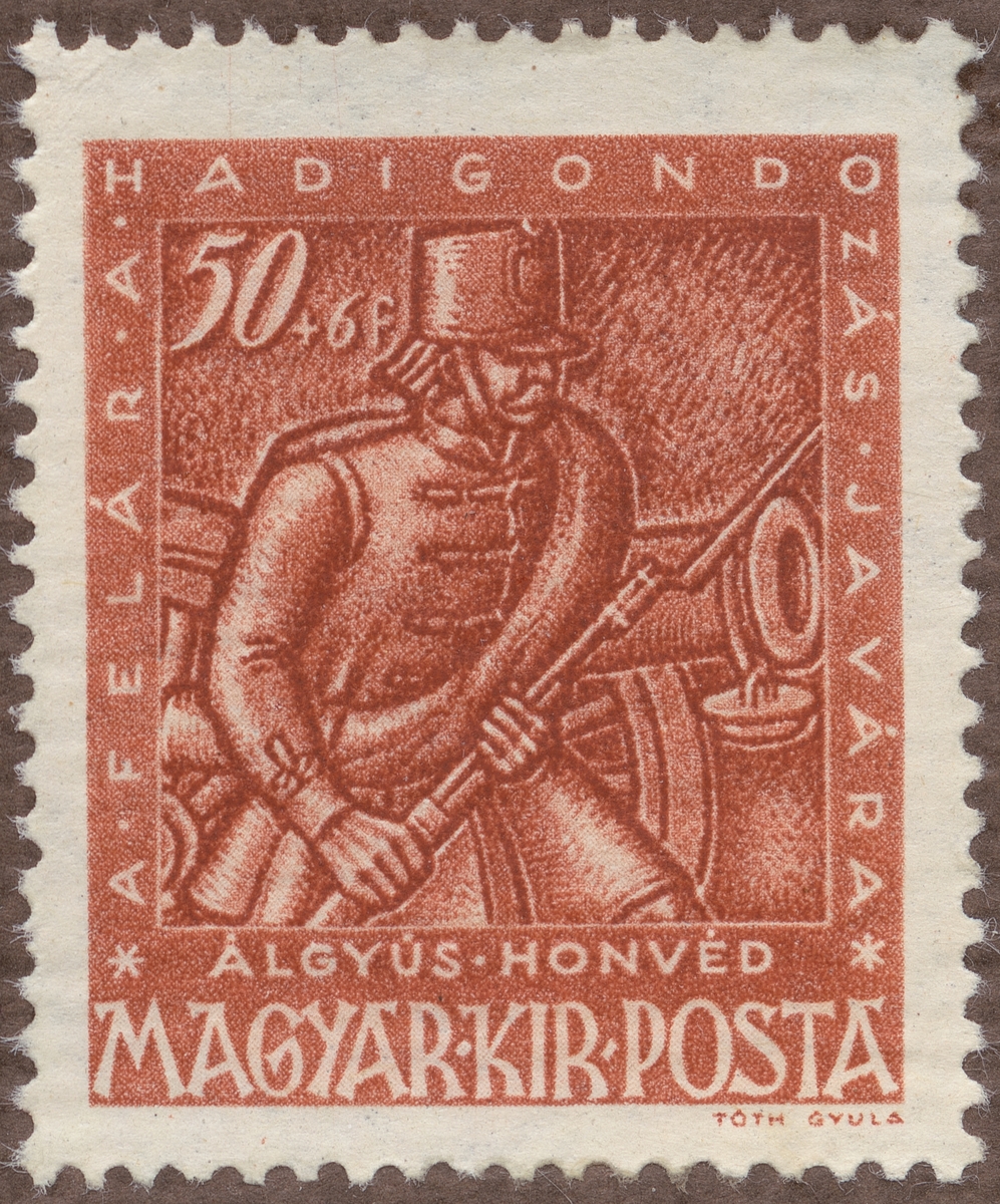 Frimärke från Ungern, 1941. Motiv av Ungerska eldvapen Gevär och kanon "-Serie till förmån för krigsinvalider-"
