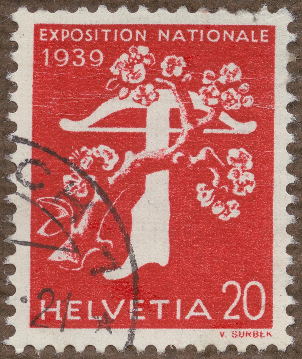Frimärke från Schweiz, 1939. Motiv av Pilbåge Trädgren -Propaganda för Utställning i Zürich 1939-