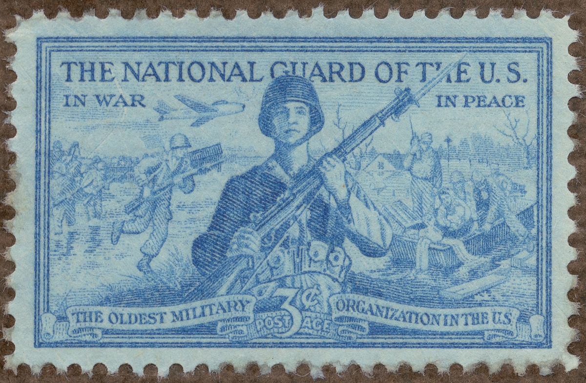 Frimärke från U.S.A., 1953. Motiv av Soldat med gevär Krigsbilder "National Guard of the U.S." The oldest military organisation in U.S.A.