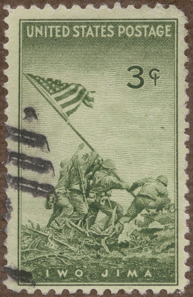 Frimärke från U.S.A., 1945. Motiv av Iwo Jimas erövring: - Amerikanska flaggan hissas på Suribachiberget- -Japan- Minne av "U.S. Marines´" insats i världskrig II.