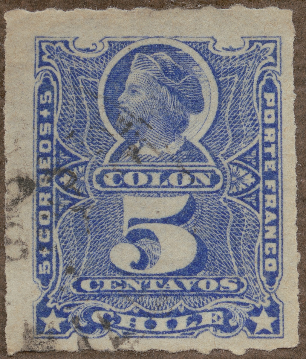 Frimärke från Chile, 1878. Motiv av (Christobal Colón) Christoffer Columbus 1446-1506 -1492: första resan över Atlanten-