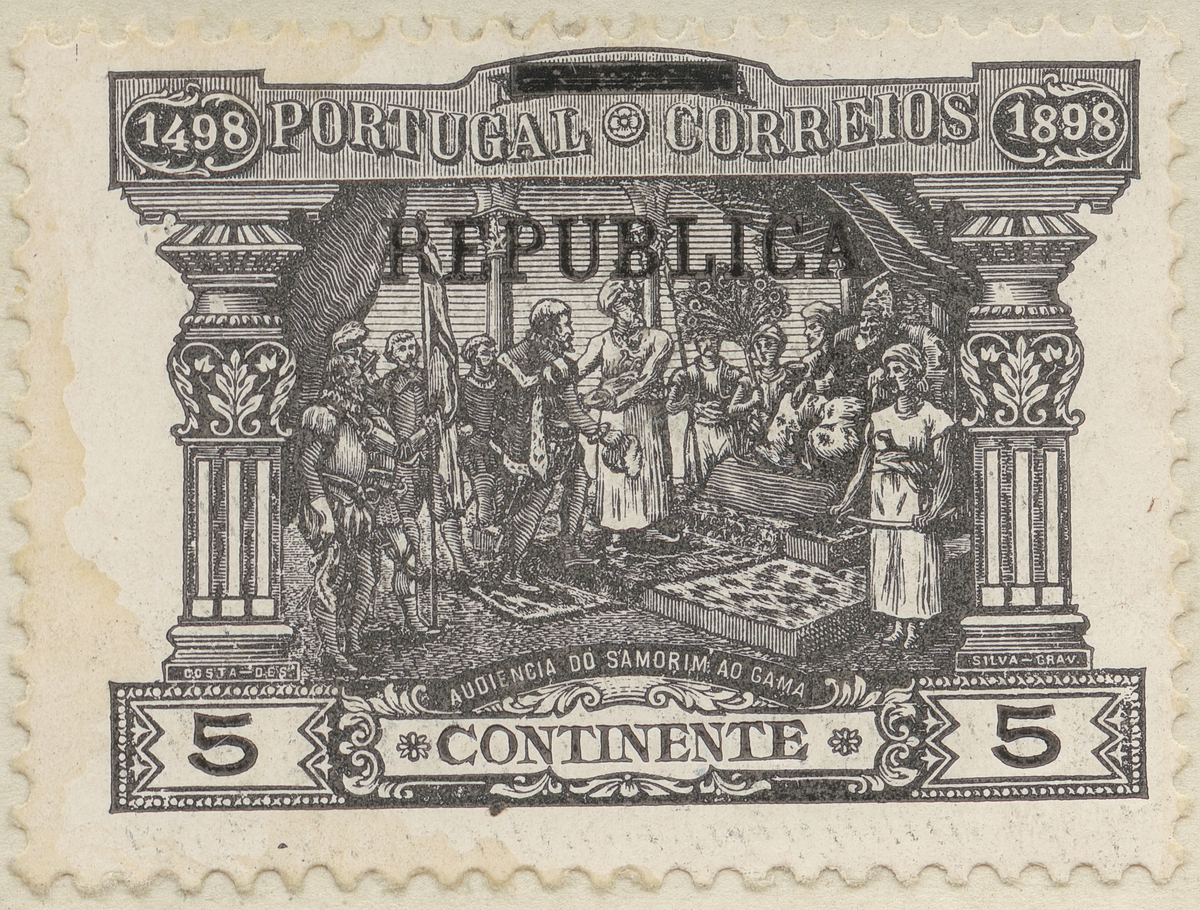 Frimärke från Portugal, 1898. Motiv av Hindu-Fursten Zamorin mottager Vasco Da Gama i audiens 1498 i sin huvudstad Calicut, Indien. 400-årsminne: 1498-1898.