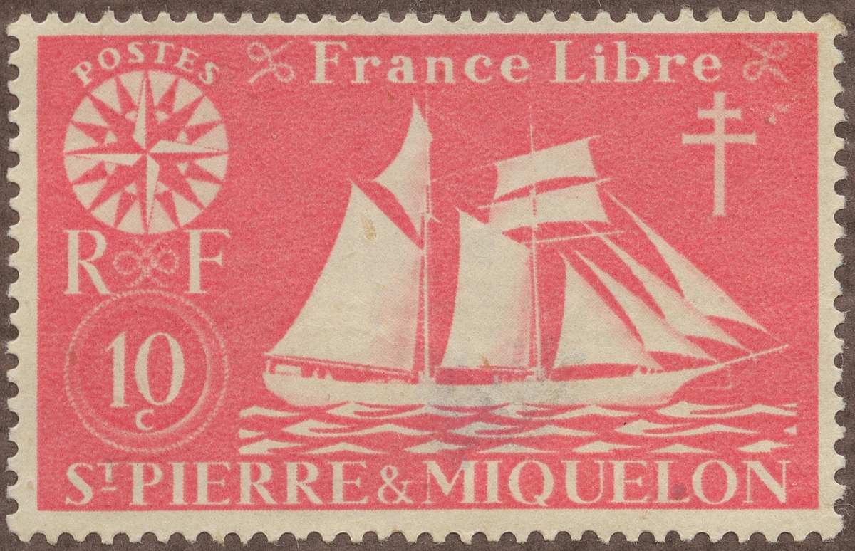 Frimärke från S:t Pierre et Miquelon, 1942. Motiv av -Toppsegelskonert: fiskefartyg från St. Malo- "-Serie: France Libre-"