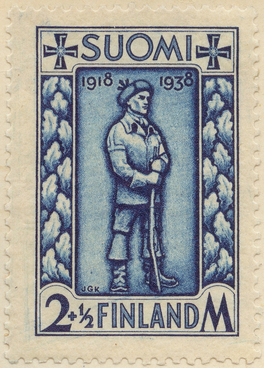 Frimärke från Finland, 1938. Motiv av Front soldat -1918- -Till förmån för finska soldater från världskrig I.