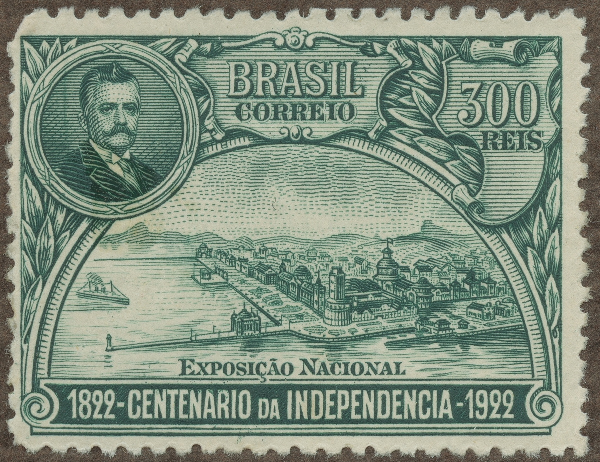 Frimärke från Brasilien, 1922. Motiv av Nationalutställningen i Brasilien 1922