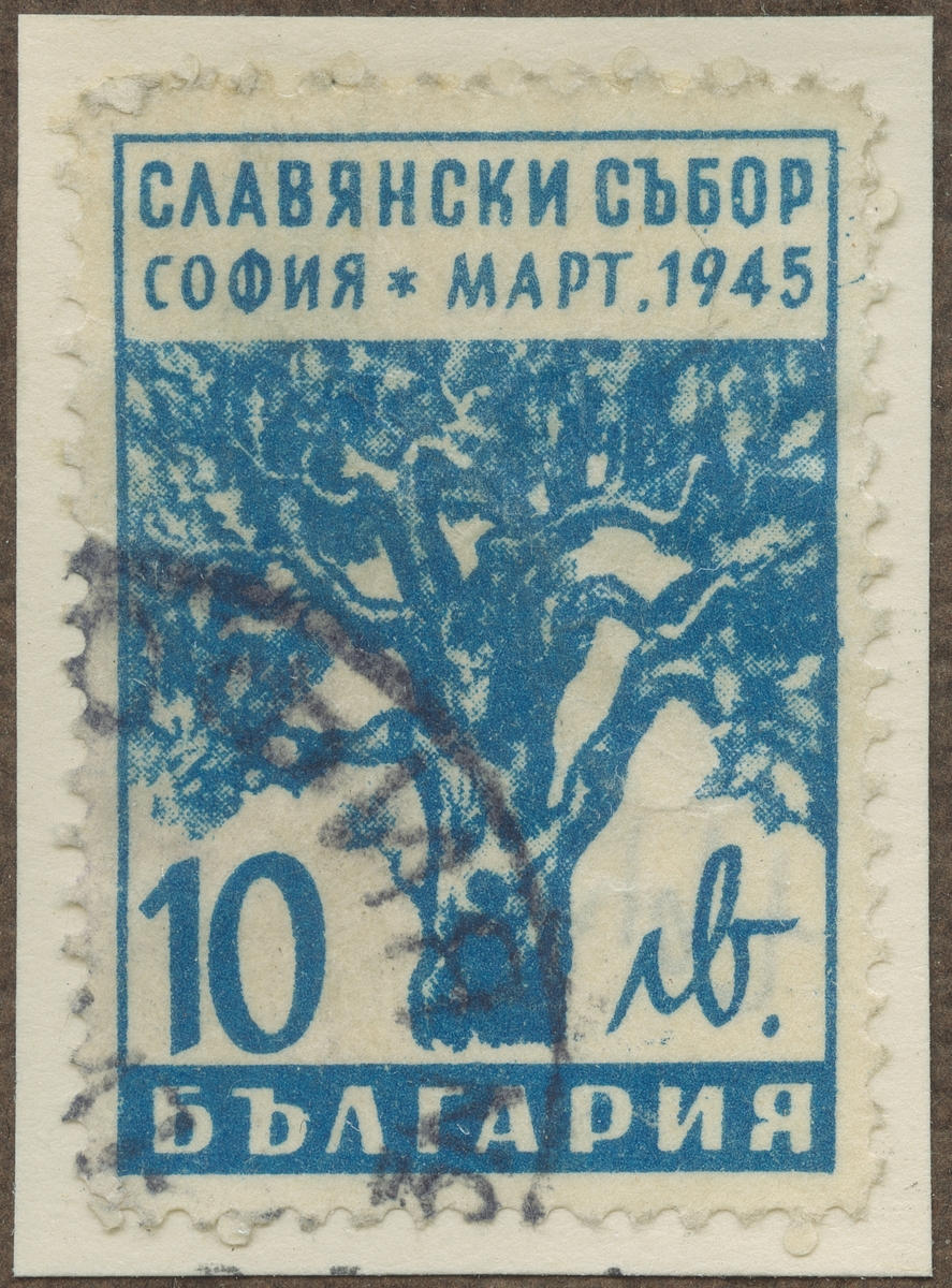 Frimärke från Bulgarien, 1945. Motiv av Träd Med krona Minne av d 9 mars 1945 Pan-slavisk kongress i Sofia 1945.