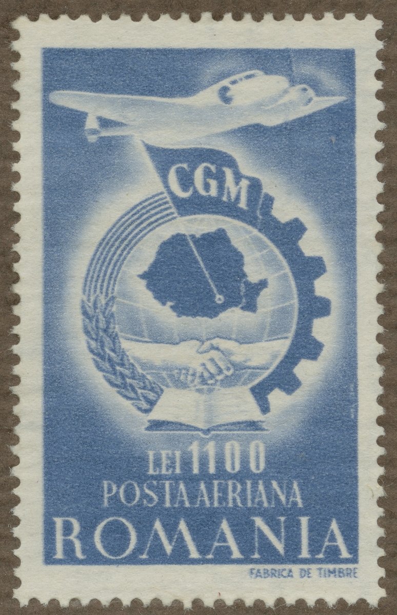 Frimärke från Rumänien, 1947. Motiv av karta över Rumänien. Monoplan. "1:sta kongressen C. G. M.".