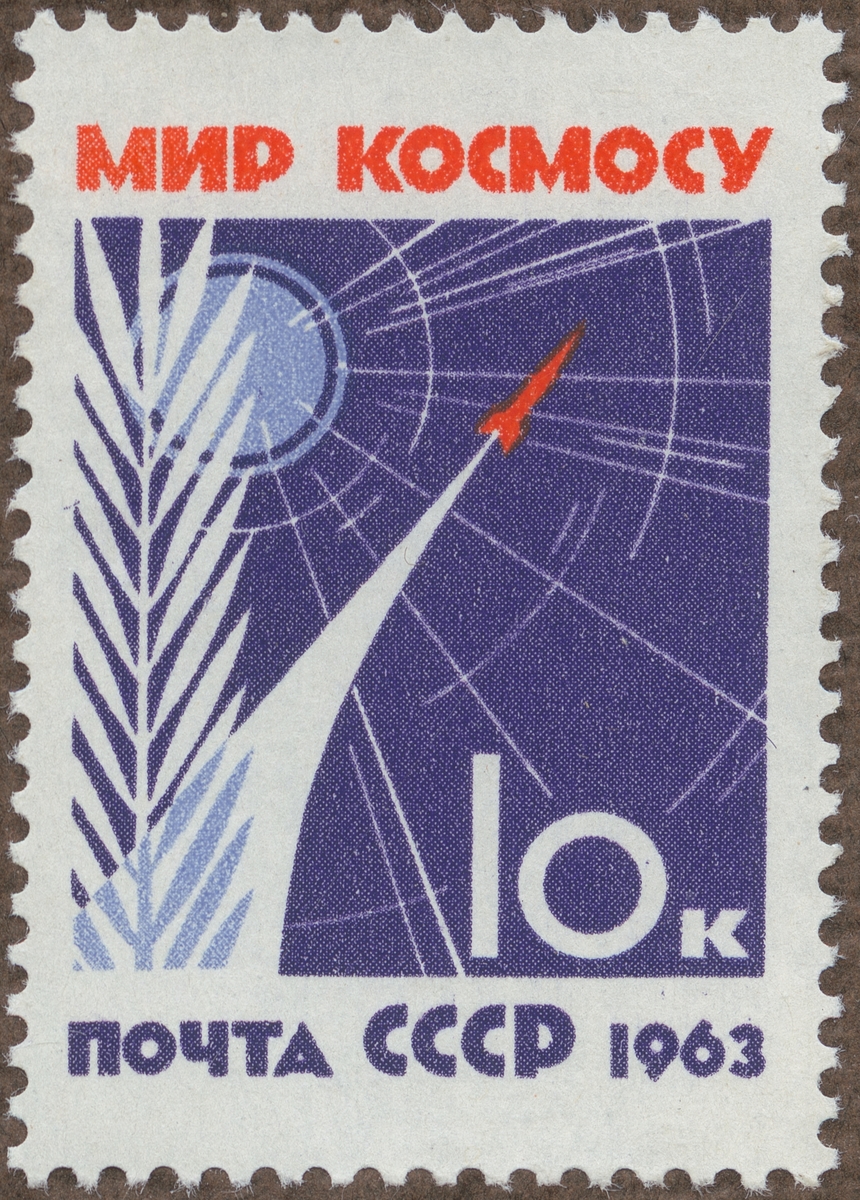 Frimärke från Ryssland, 1963. Motiv av "En värld utan vapen och krig." Palmkvist och stiliserad rymdkarta "-Propaganda för fred-"