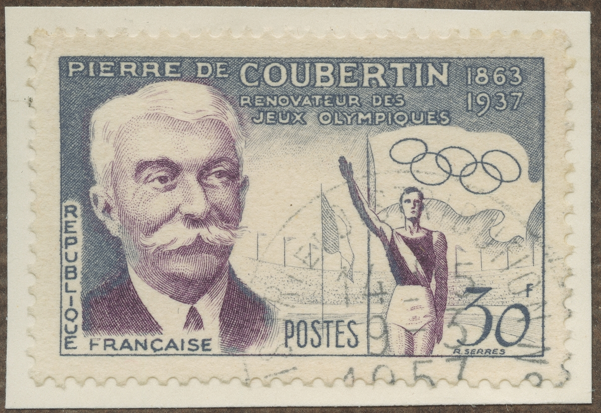 Frimärke från Frankrike, 1957. Motiv av Pierre de Coubertin, 1863-1937. Olympiska Spelens Återupplivare.