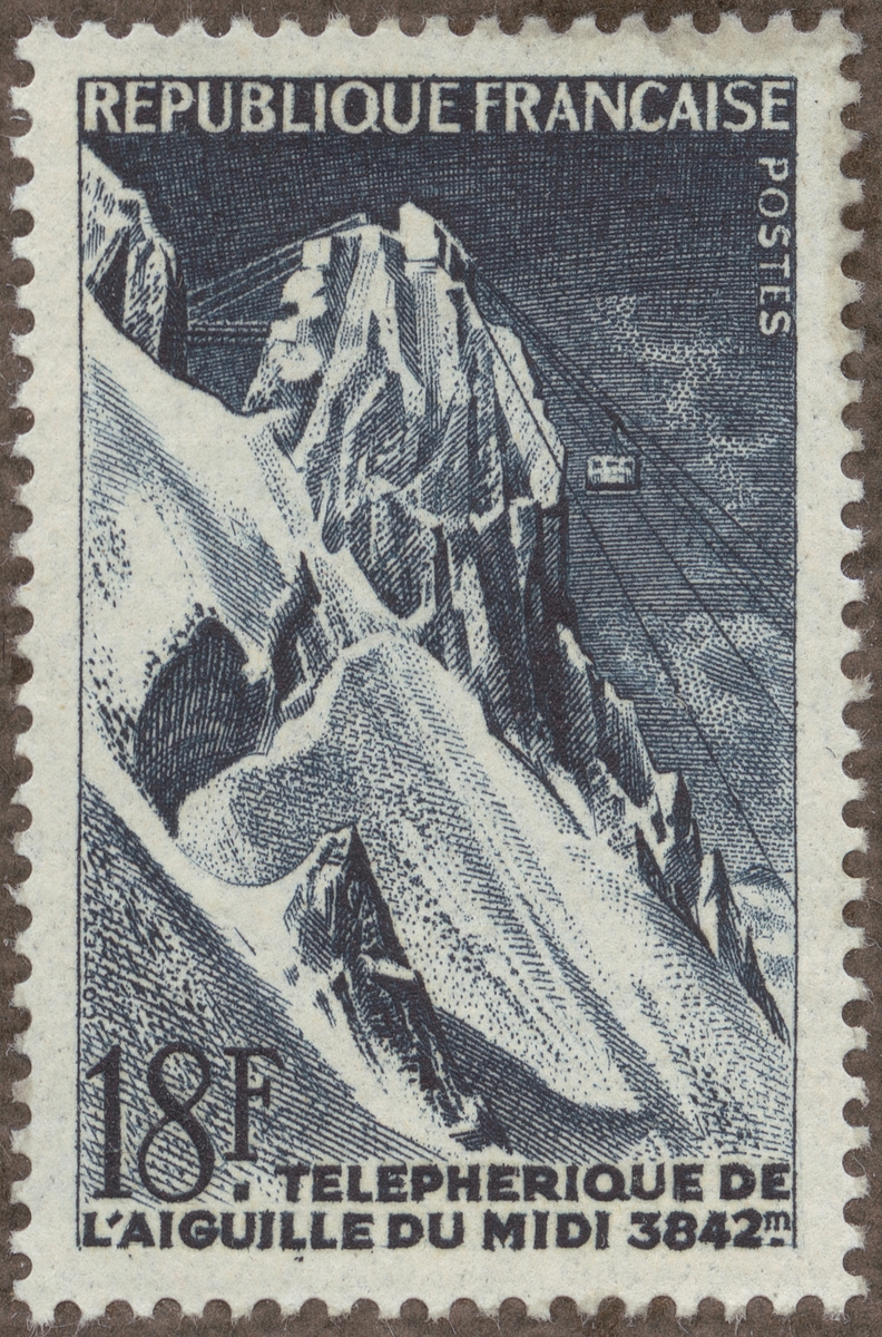Frimärke ur Gösta Bodmans filatelistiska motivsamling, påbörjad 1950. Frimärke från Frankrike,1956. Motiv av Elektrisk linbana till Pic du Midi 3.842 m.